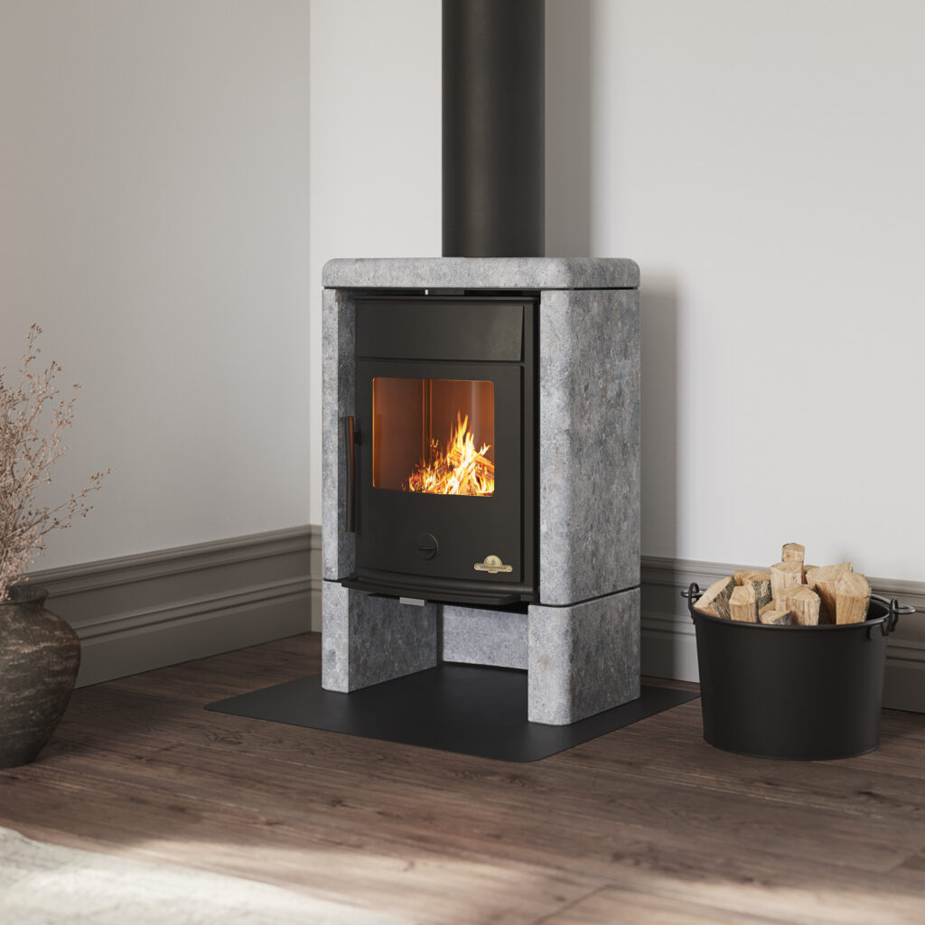 Braskamin tillverkad av 240 kg gjutjärn och täljsten. Lagrar värme i timmar.