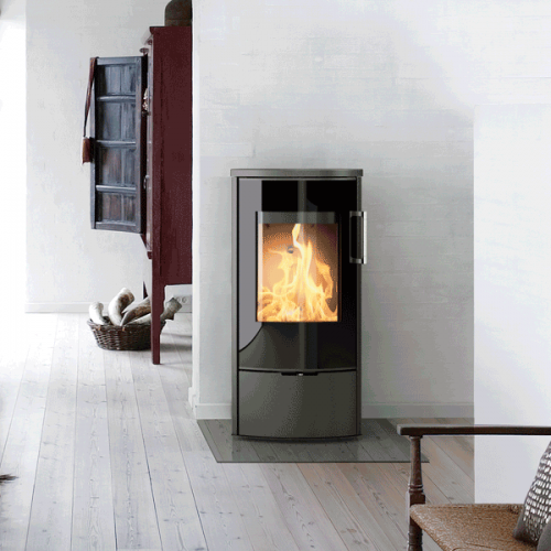 Den formidabla rutan gör att man verkligen kan se elden. Enkel och smidig eldning, elegant designat handtag. Praktiskt utrymme för redskap längst ner – öppnas med ett lätt tryck. Den koniska formen med den formgivna topplattan ger ett smakfullt uttryck. Finns med glas- eller stållucka.
