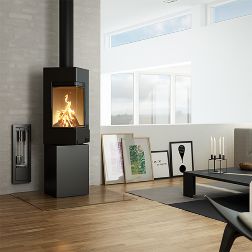 Denna kamin har en supertrendig, kubistisk stil och en fantastisk lucka som gör elden till en fenomenal upplevelse i rummet. Man kan dessutom vrida den övre delen på kaminen så att lågorna kan riktas enligt önskemål. En markant och levande skulptur i bostaden som ger ett elegant uttryck även när den placeras i ett hörn.