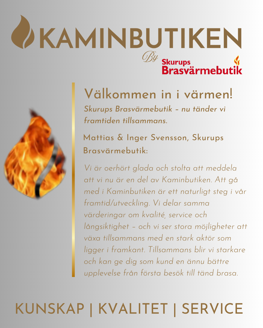 Vi är oerhört glada och stolta att meddela att vi nu är en del av Kaminbutiken. Att gå med i Kaminbutiken är ett naturligt steg i vår framtid/utveckling. Vi delar samma värderingar om kvalité, service, och långsiktighet — och vi ser stora möjligheter att växa tillsammans med en stark aktör som ligger i framkant. Tillsammans blir vi starkare och kan ge dig som kund en ännu bättre upplevelse från första besök till tänd brasa.